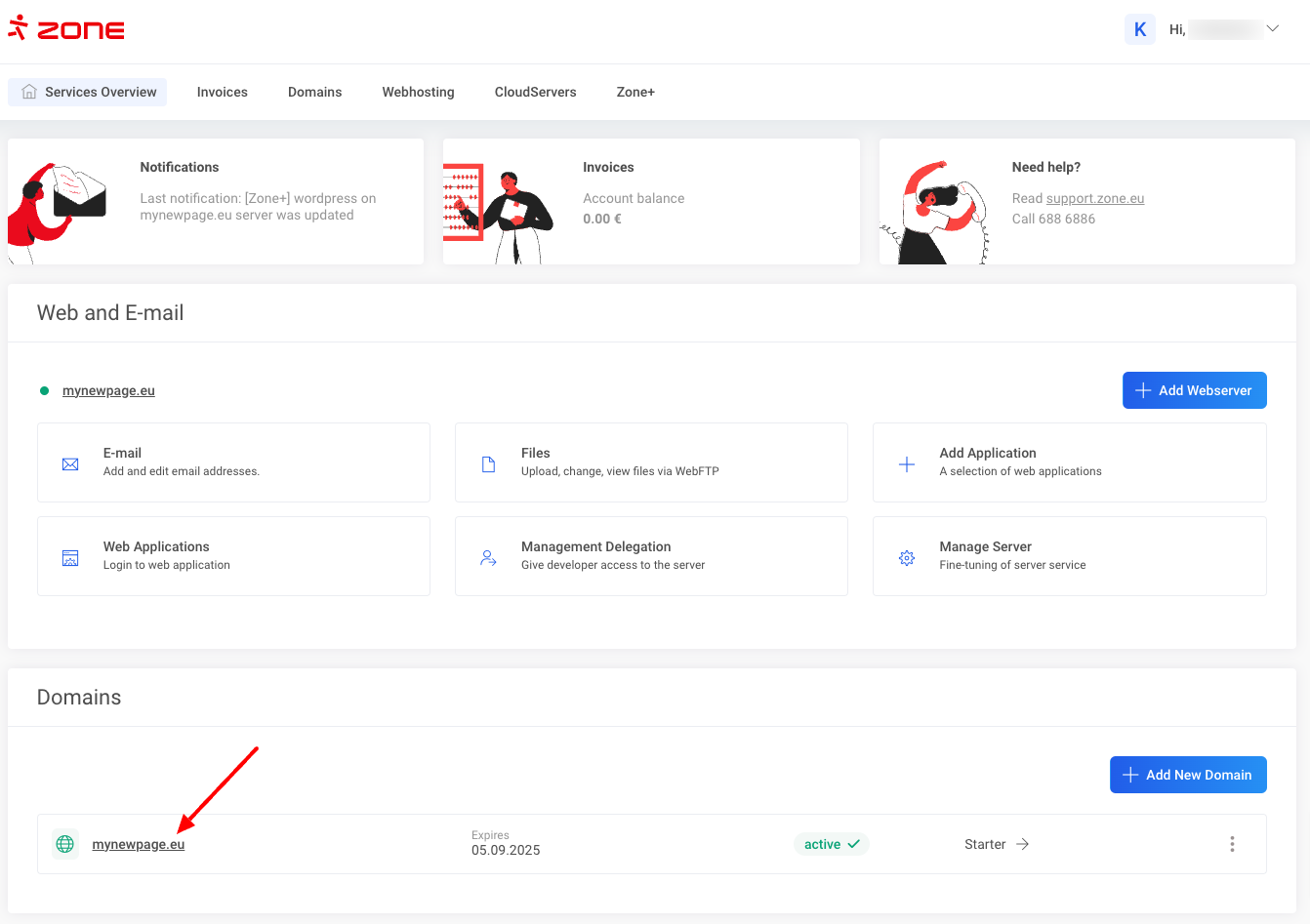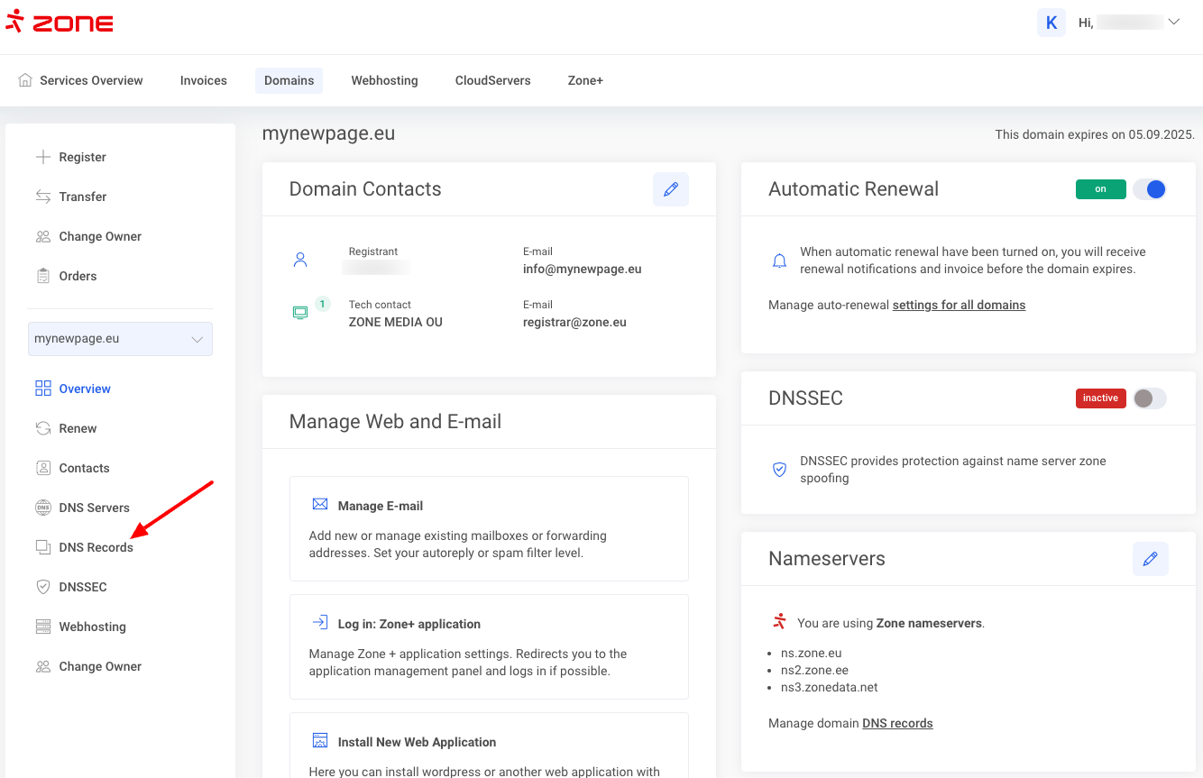 To change the domain’s DNS records, please log in to My Zone environment and click on the desired domain name from Services overview window.