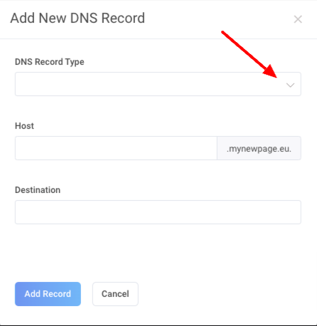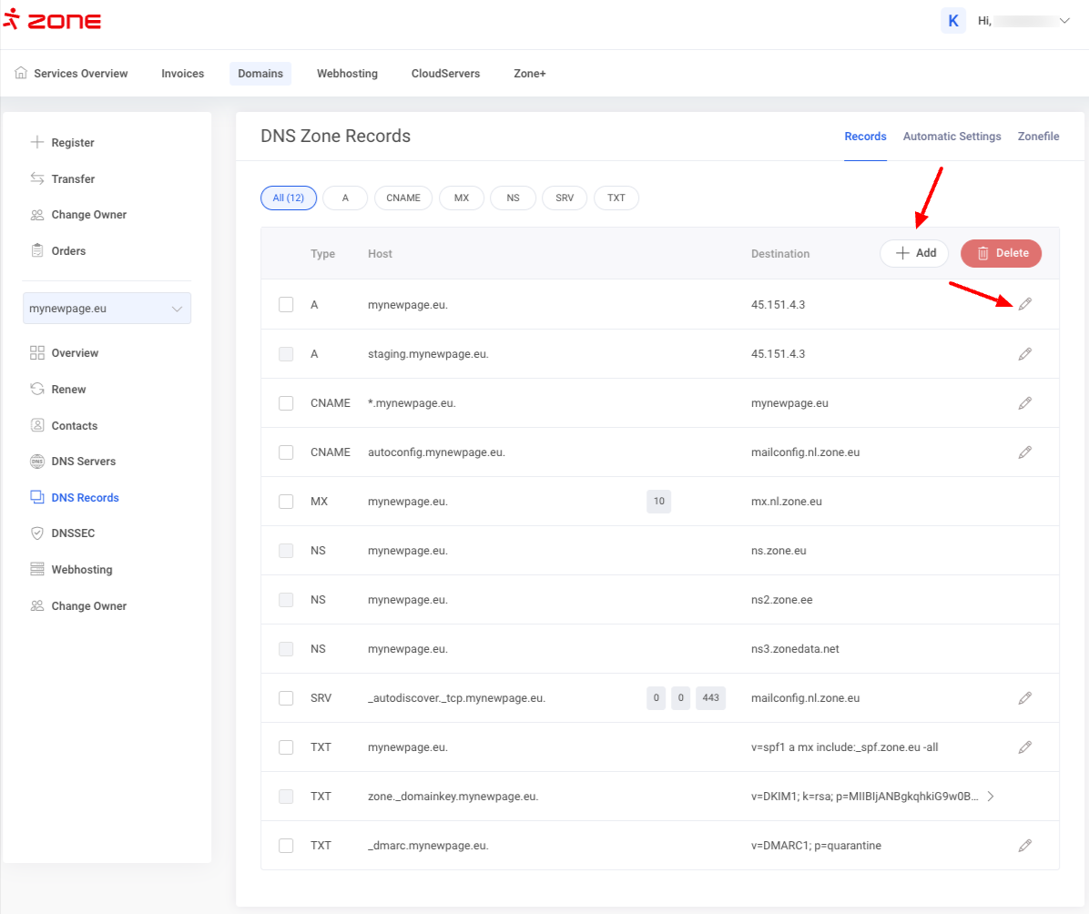 In the next window you can change existing DNS records by clicking the the Pencil icon behind the record or add a new record with + Add Record button