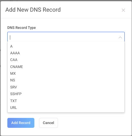+ Add Record function allows you to add the following records for your domain: A, AAAA, CAA, CNAME, MX, NS, SRV, SSHFP, TXT, URL.