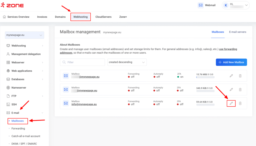 Click WebhostingE-mailMailboxes and click on the pencilicon.