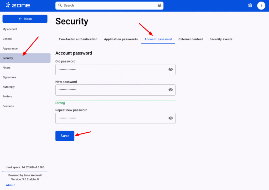 If you don’t have access to My Zone management, it’s possible to change the password via webmail if you know the current password of the mailbox.