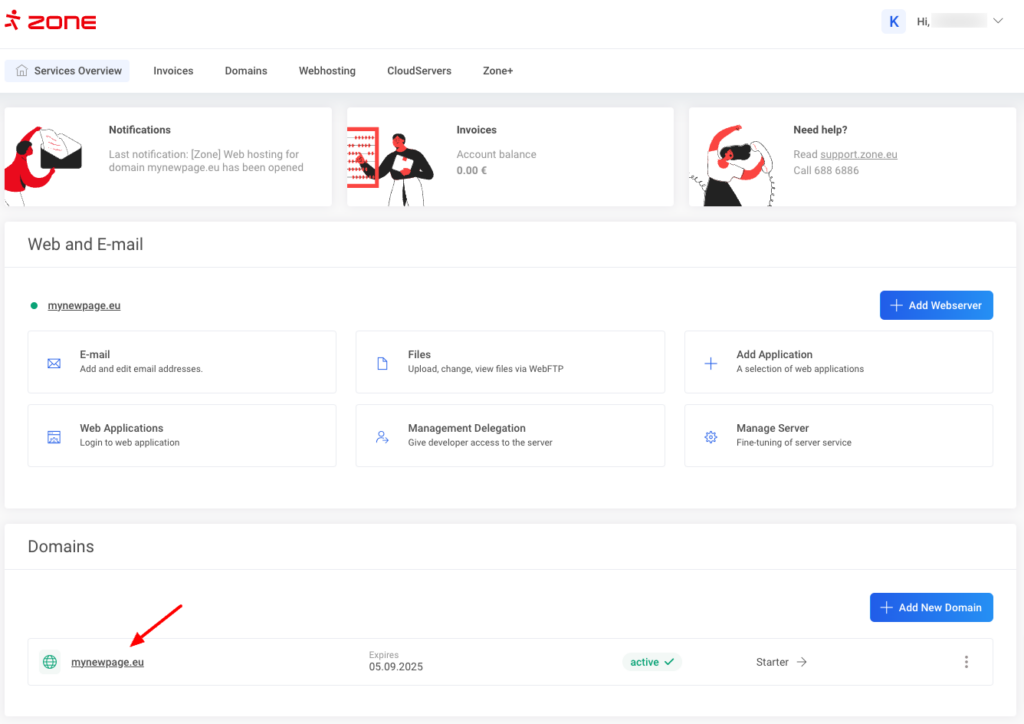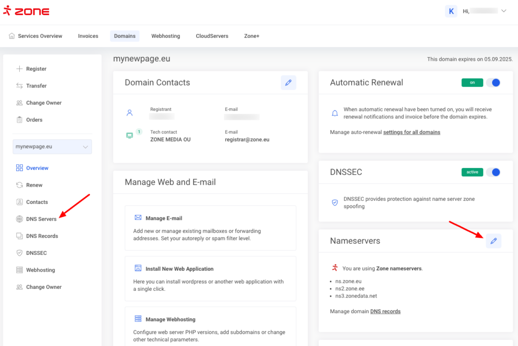 For domains in Zone registrar, you can change nameservers from My Zone control panel by clicking on your domain name from Services overview window.