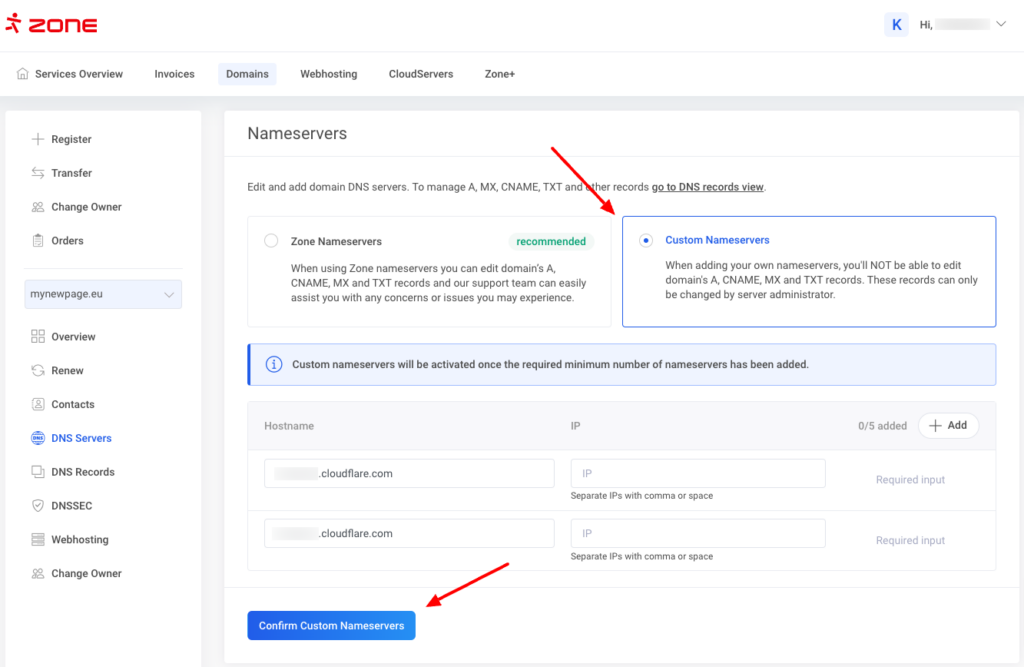Activate Custom Nameservers option and insert the desired nameservers in the fields below. Each on a separate line and confirm.