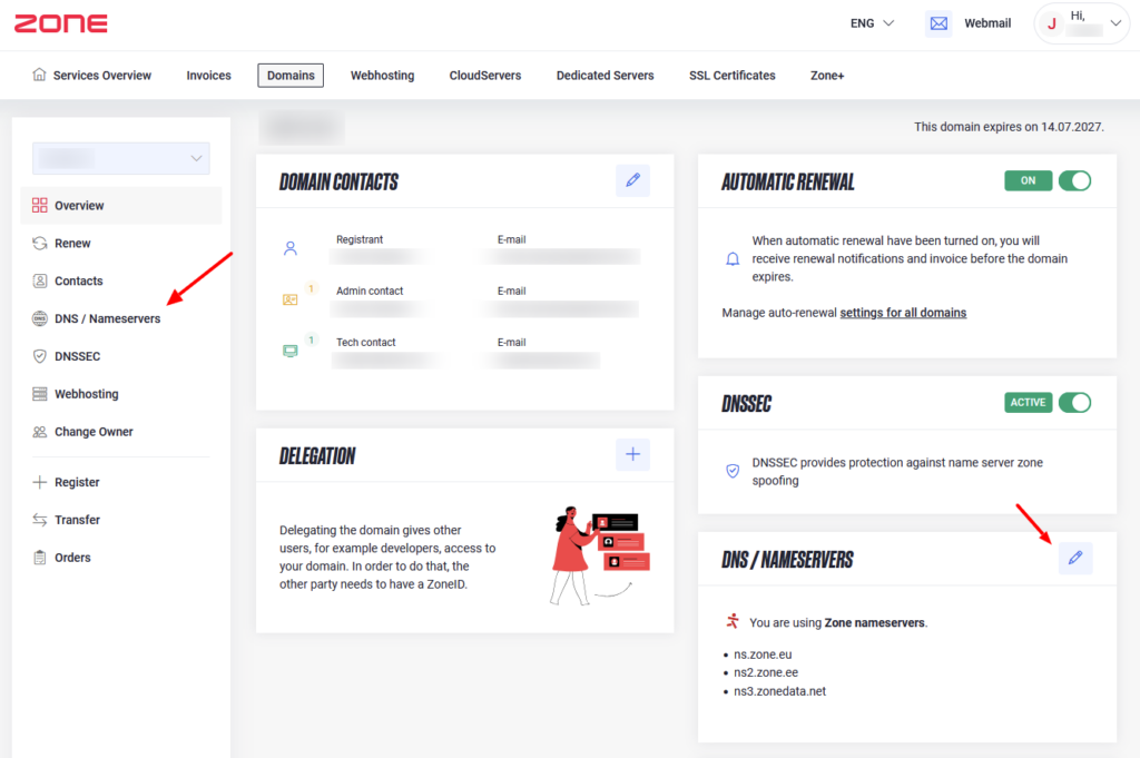 For domains in Zone registrar, you can change nameservers from My Zone control panel by clicking on your domain name from Services overview window.