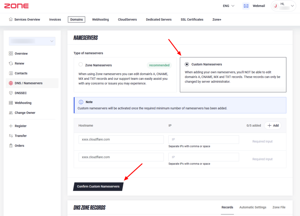 Activate Custom Nameservers option and insert the desired nameservers in the fields below. Each on a separate line and confirm.