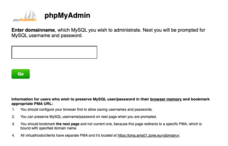 If you managed to close My Zone already, the direct link to phpMyAdmin is: https://pma.ams01.zone.eu/