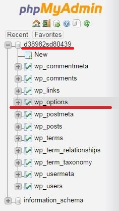 In the phpMyAdmin environment, click on the database name in the left block, then select wp_options in the opened option (instead of wp, table may also have a different prefix).