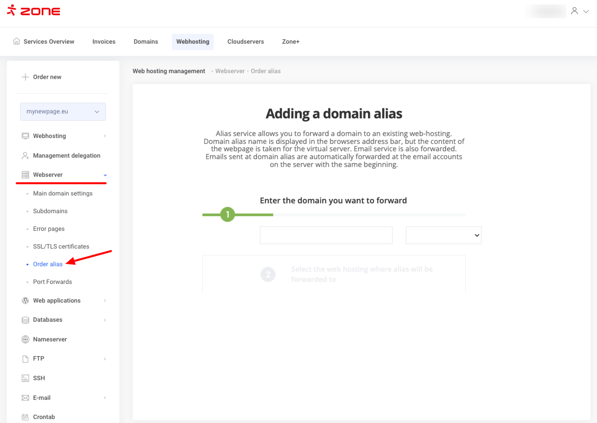 The domain alias will be added automatically. If your domain is registered via Zone and is using our nameservers then the A-record will be pointed to the correct IP-address.