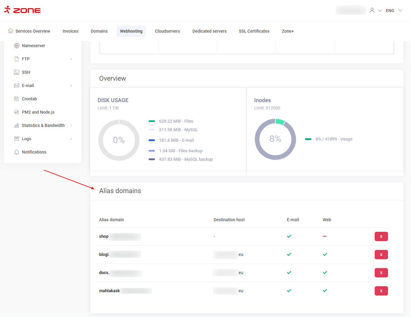 You can see the name of the alias domain aswell as the destination host. Should you wish to delete the alias, simply click on the red X button.