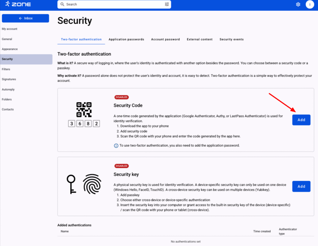 In the Security code menu, click Add.