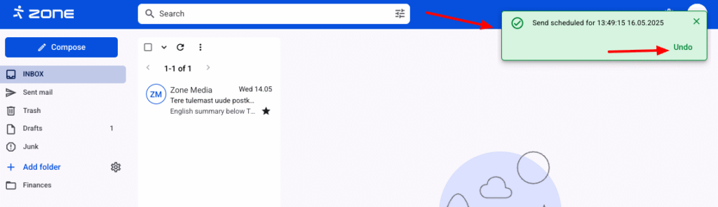 When you send an email, you will see the message Sent scheduled for and date as well as time. Next to it the message Undo. Depending on the selected time, the sending can be cancelled. The cancelled e-mail is moved to the Drafts folder.