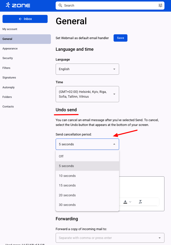 In Webmail, under general settings, you can change your preferred time zone, control panel language, screen view, cancellation period for sent emails, the format of the emails you compose, and redirect copies of incoming emails to other email addresses.