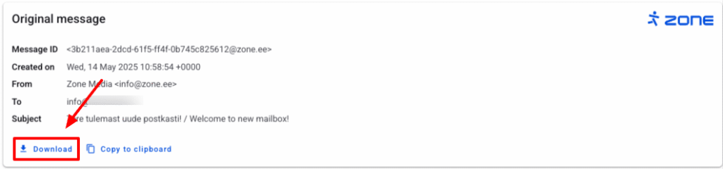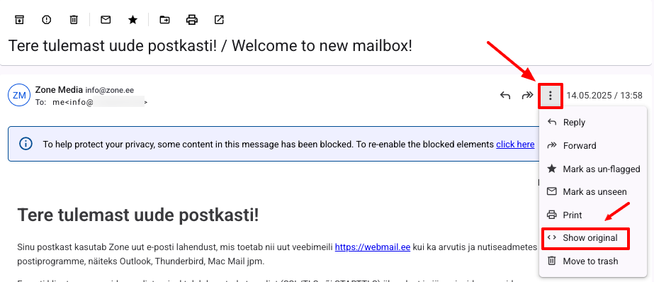 To download an email in .eml format, log in to Webmail. Then open the desired e-mail and choose Show original from the three-dot menu in the upper right corner.
