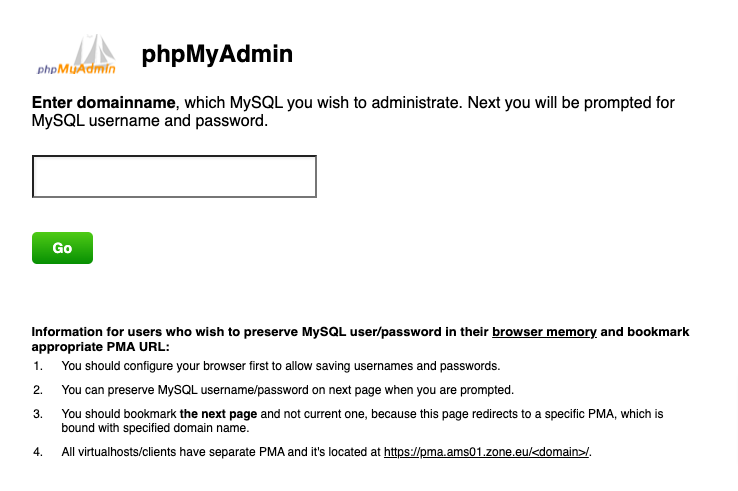 The phpMyAdmin interface for MySQL/MariaDB database management can be logged in via: pma.ams01.zone.eu