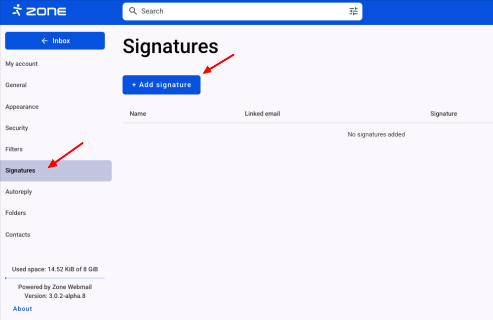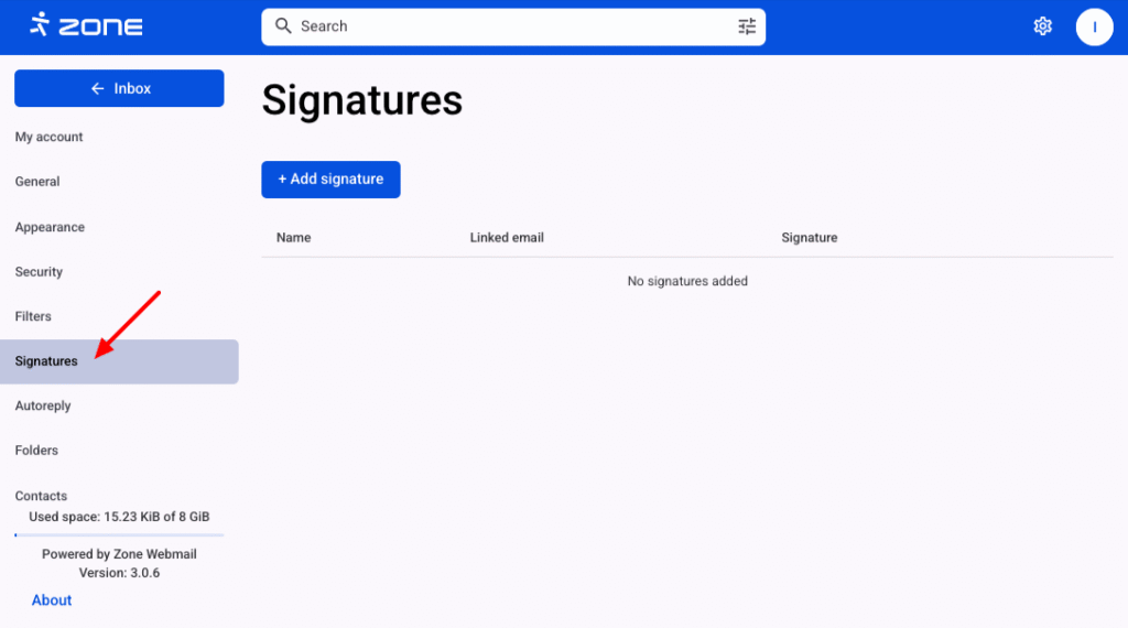 Signatures can be managed in the Signatures section.