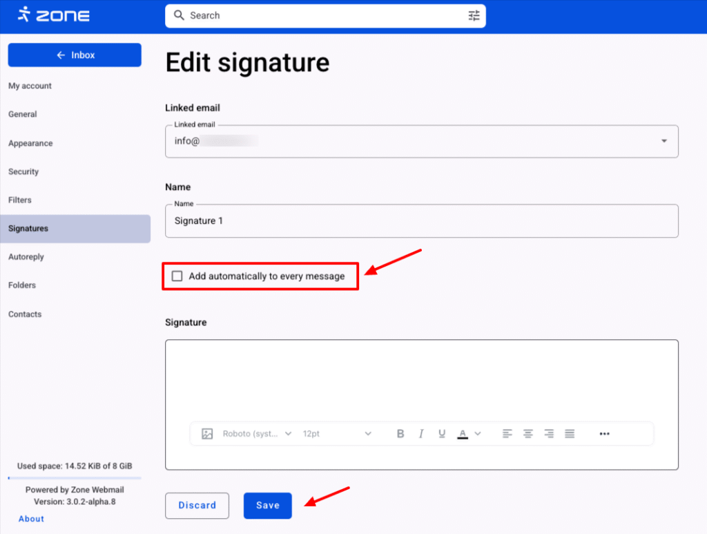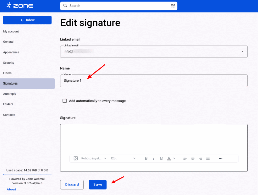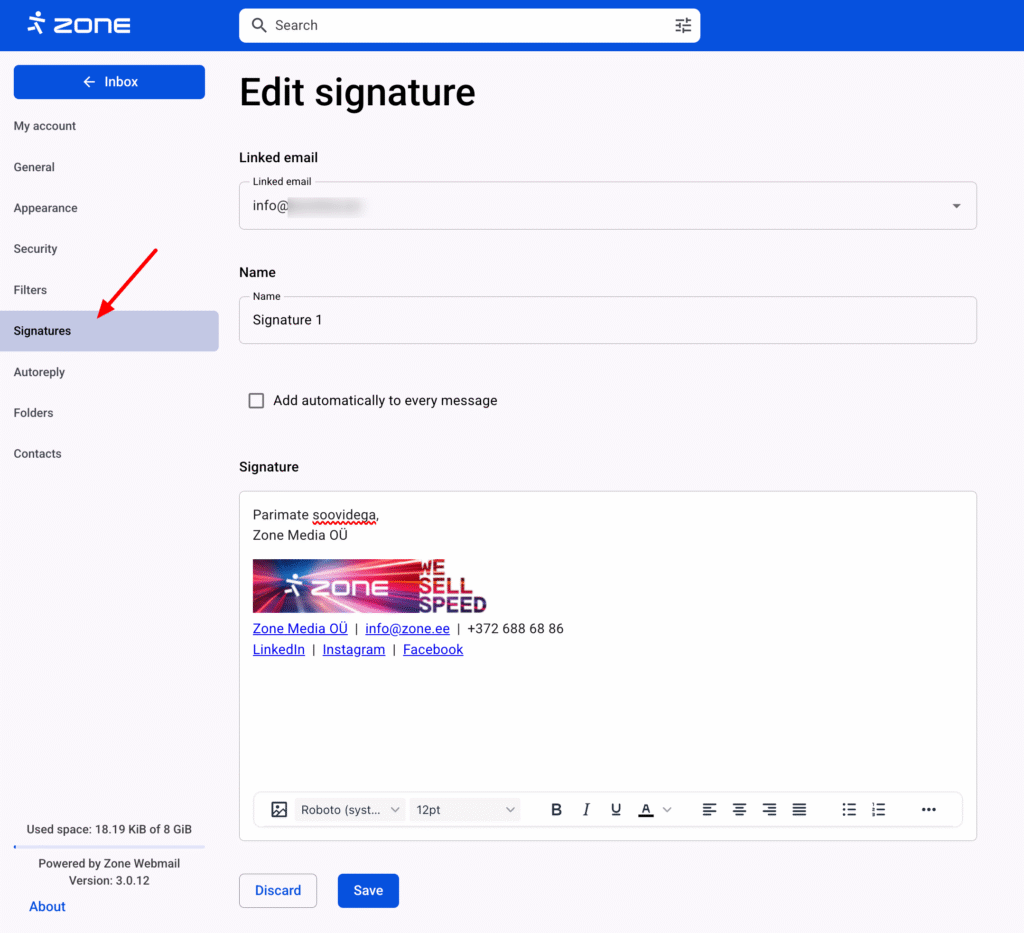 In the Webmail.ee, it is possible to add signatures to your outgoing emails and manage them as needed.