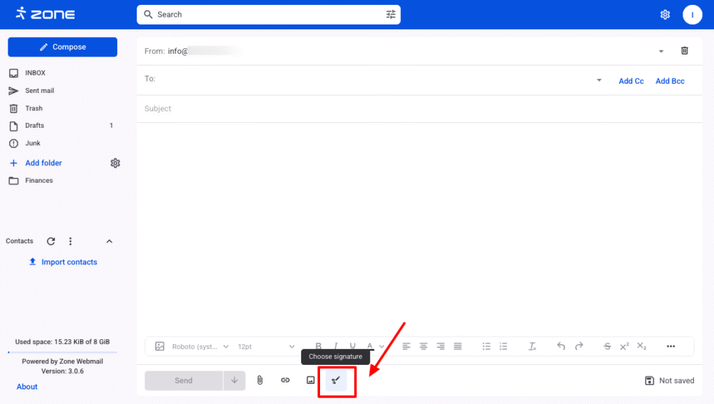 After saving the signature, you can add existing signatures to your composed email by clicking the Choose signature button. The signature will be inserted at the location of the text cursor.