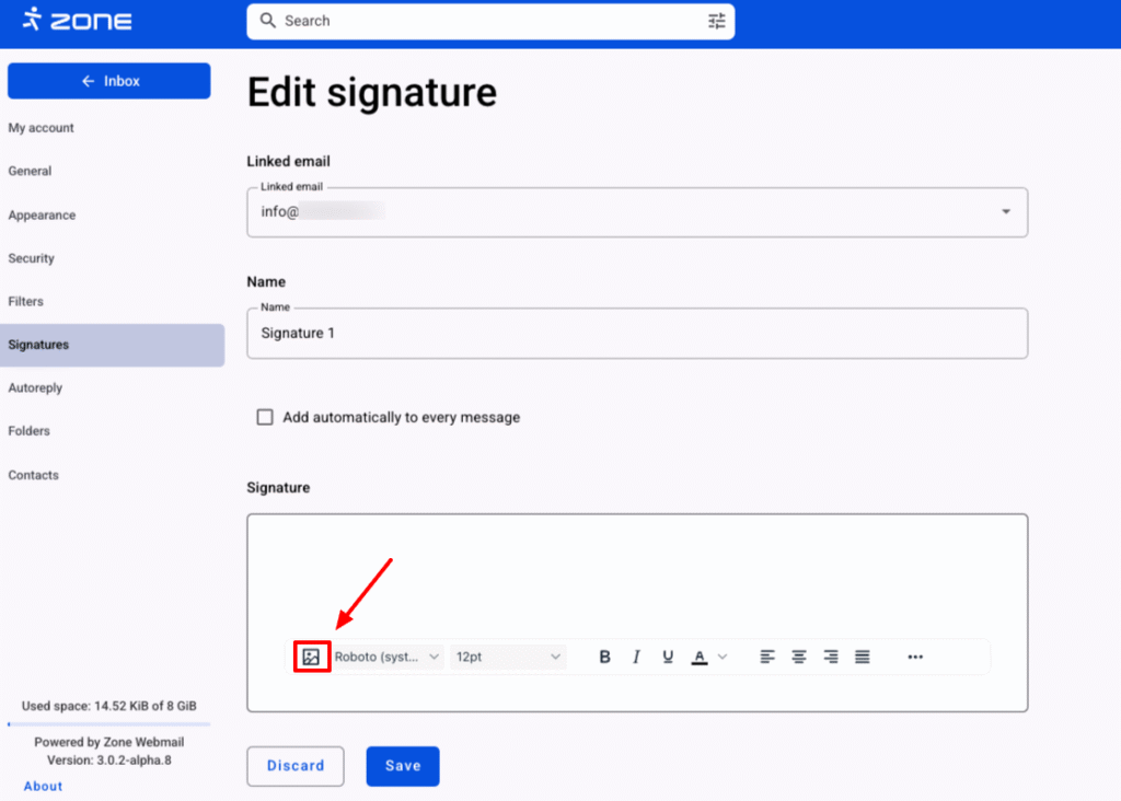 The signature may contain images and an image can be added using the corresponding button.