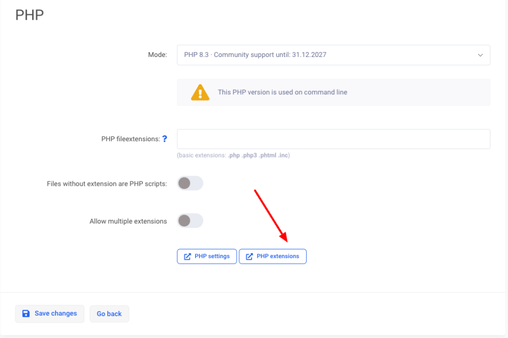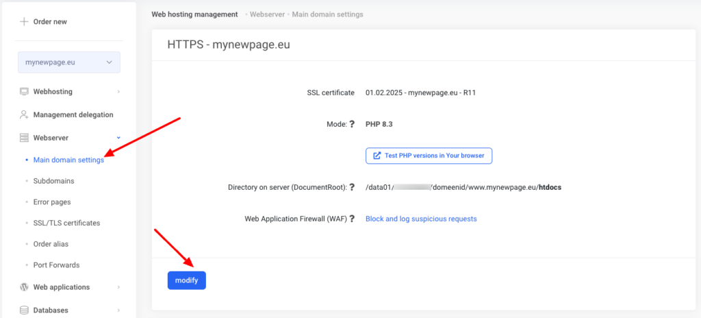 To do this, choose from menu on Webhosting page: Webserver -> Main domain settings or Subdomains depending on whether you want to activate or change the PHP extension on the main domain or on the subdomain.