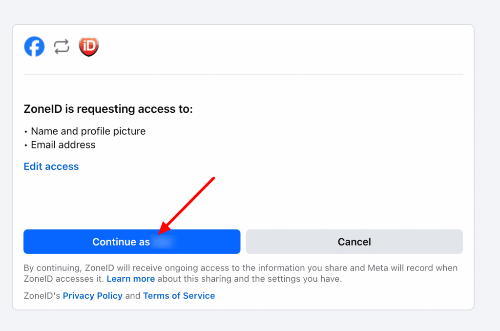 Next, the information about your Facebook account and the selection of associated ZoneID accounts will be displayed. If there are multiple ZoneID accounts linked to this Facebook account, you can choose the preferred one from the dropdown menu. Then, click Continue as ....