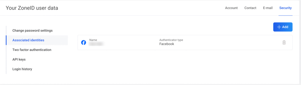 In order to connect Facebook with your ZoneID account, first log in to My Zone control panel with your username and password, then open Settings and Security under your username. Next select Associated identities.