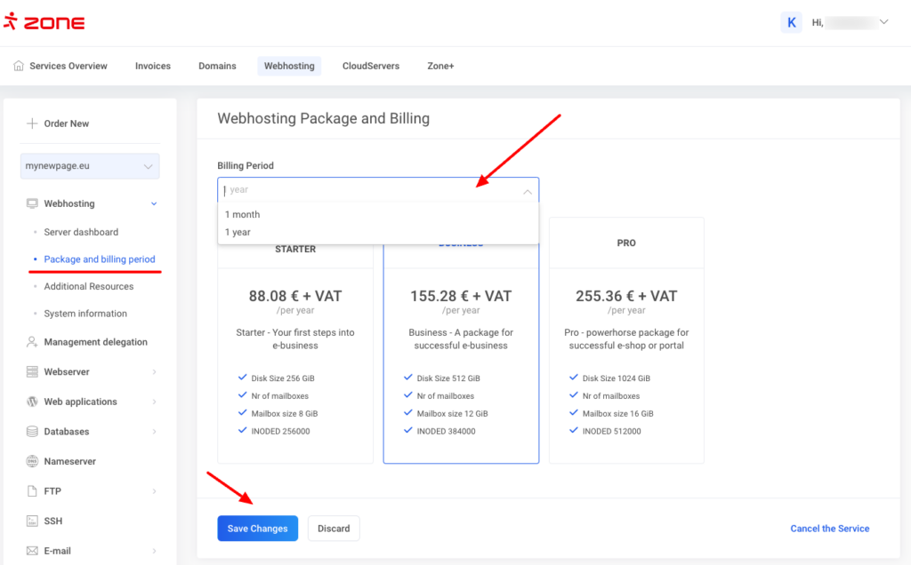 It is also possible to change the billing period in My Zone in the web hosting administration under Webhosting and Package and billing period. The change will take effect from the next invoice. If you would like to make the change earlier, please send an email to support@zone.eu.