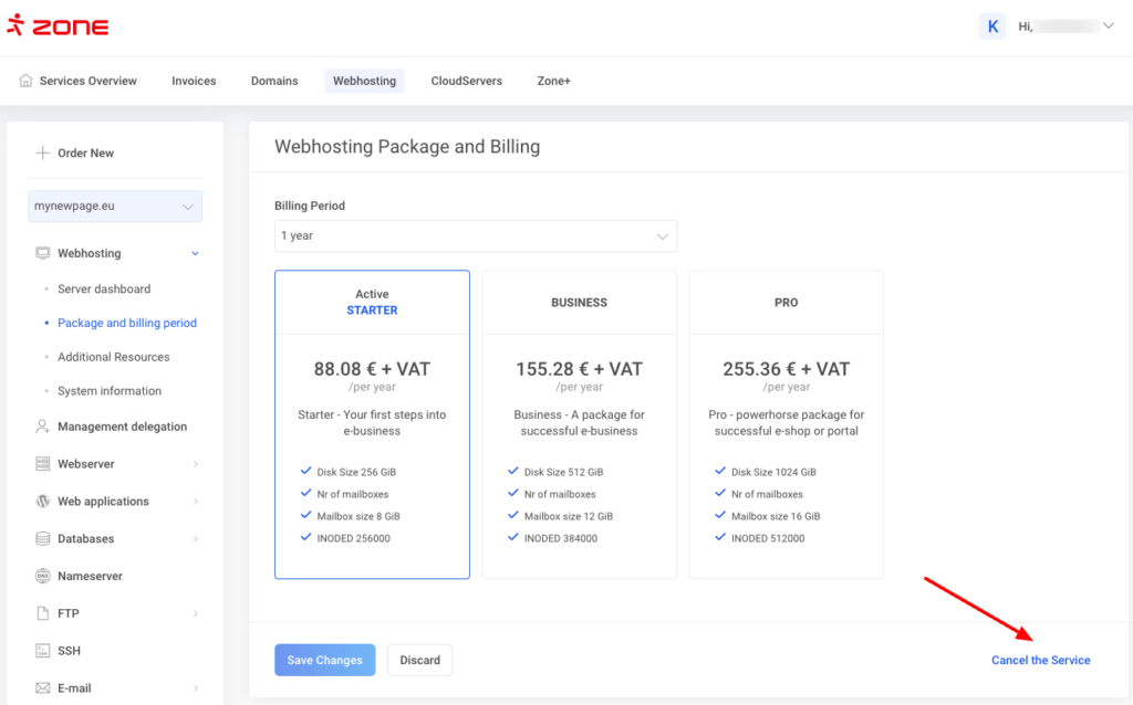 It is only possible to change the web-hosting package to a larger one (e.g. Starter -> Business) in My Zone. To downgrade your package, please send us an email to support@zone.eu.