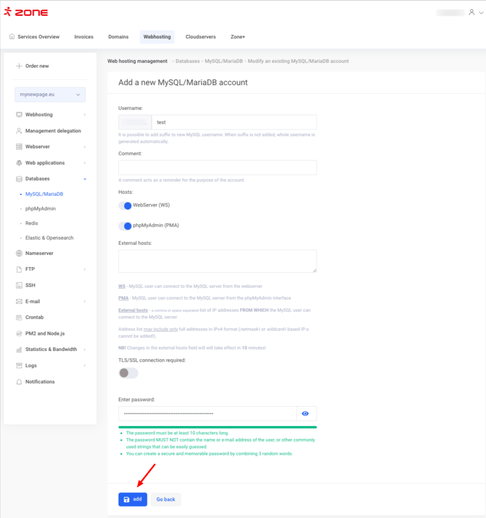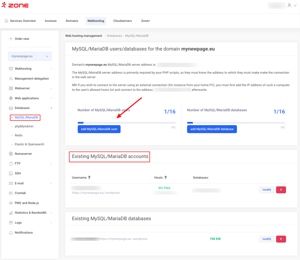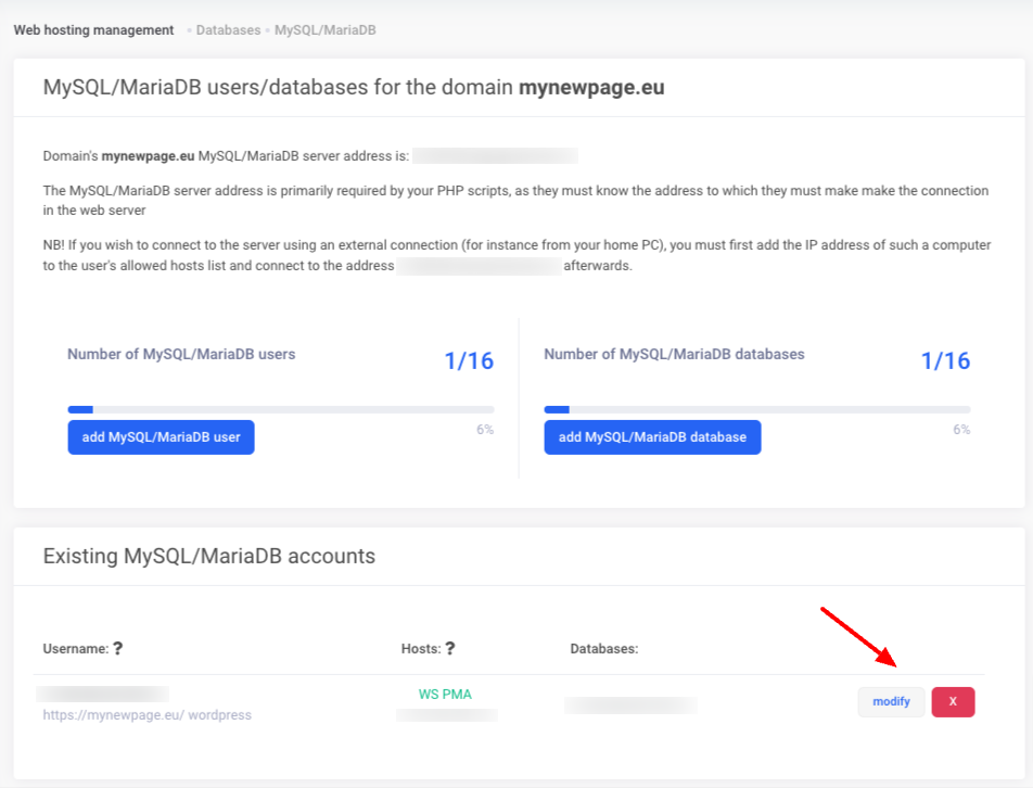 If you don’t know the existing password for a database user, you can reset it. To do this, press modify in the Existing MySQL/MariaDB accounts section.