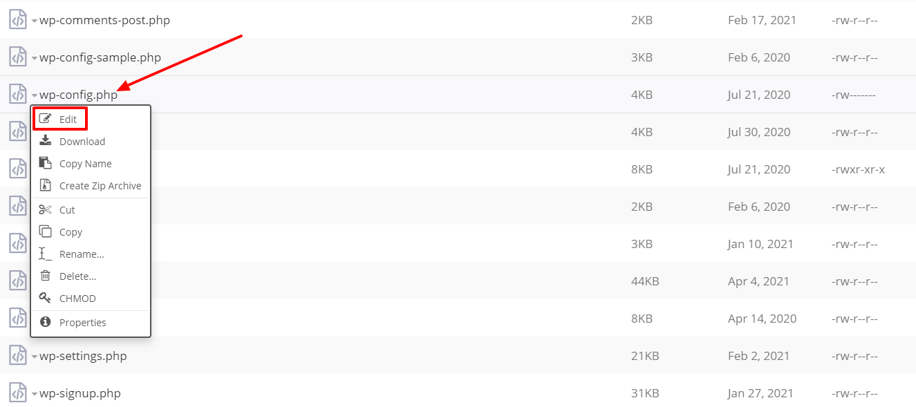 In the htdocs folder, find the file named wp-config.php, click on it and select Edit.