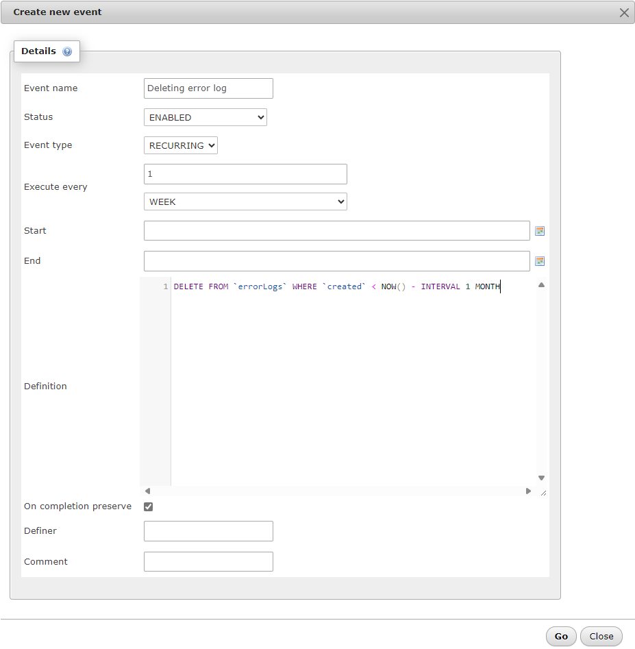 Events are database objects that contain SQL statements executed later either regularly or once. Essentially, it’s like a crontab executed directly on the database server. This is useful, for example, for archiving older data or deleting logs.