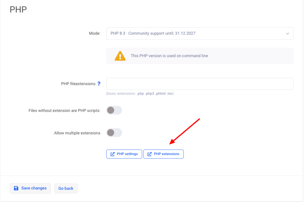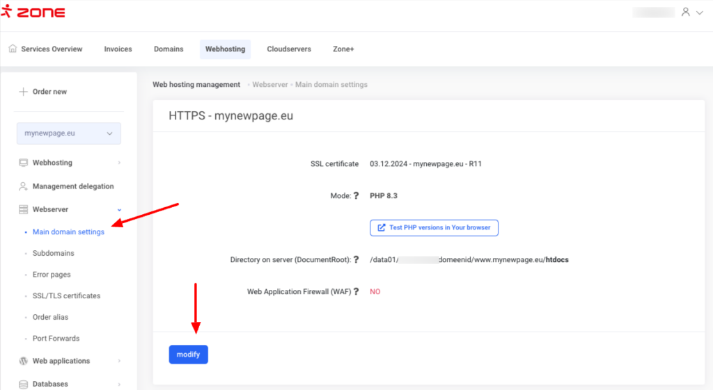 After accessing My Zone, click on Webhosting then select the desired virtual server and navigate to Webserver -> Main domain settings -> modify -> PHP extensions