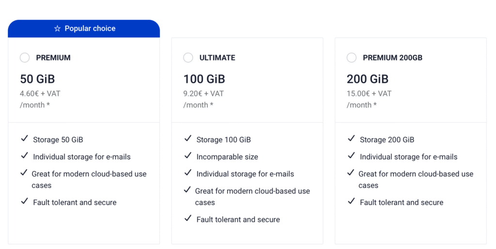 * Price with yearly paying plan is cheaper, that means Premium costs 41.40€+VAT, Ultimate 82.80€+VAT and Premium 200GB 156.00€/+VAT per year.