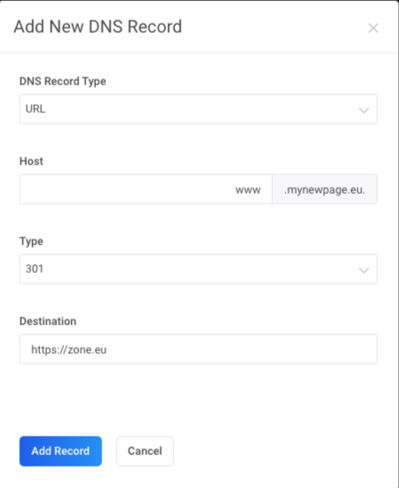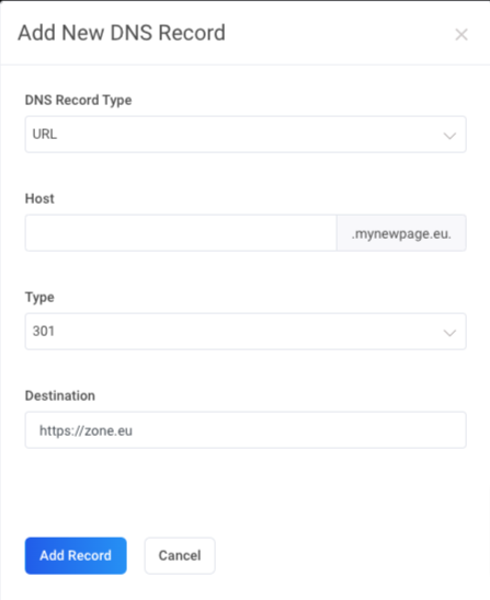 URL records allow you to redirect your domain to another address (e.g, a Facebook page). A URL record can be added to all domains registered at Zone and using our DNS servers.