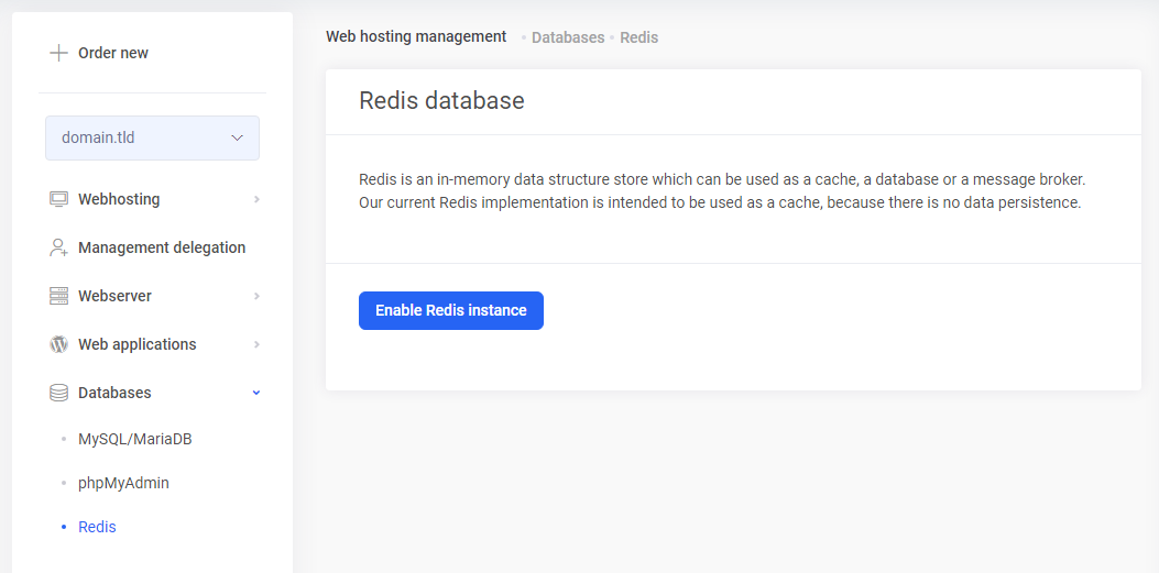 To start the Redis server, go to the Webhosting page in My Zone management, select from the menu: Databases > Redis and click on the Enable Redis instance button:
