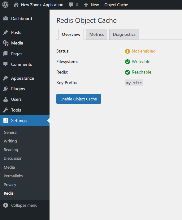 Then activate Redis by clicking the Enable Object Cache button on the same page.