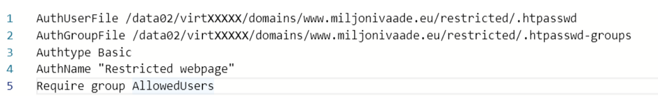 In our example, the .htpasswd file is located in the same directory as the .htaccess file (subdomains restricted.miljonivaade.eu root directory). For security reasons, it is strongly recommended to place this file in a directory that does not resolve to the web. For example to /www.yourdomain.ee/ directory … or better yet – to a directory at the same level (this can be done via SSH).