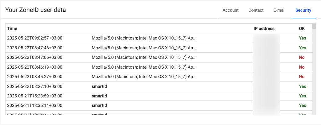 The Security menu also includes a Login history submenu which displays the ZoneID account’s authentication log. The log displays successful and failed login attempts for the last year, as well as IP-addresses from where the login attempts were made.