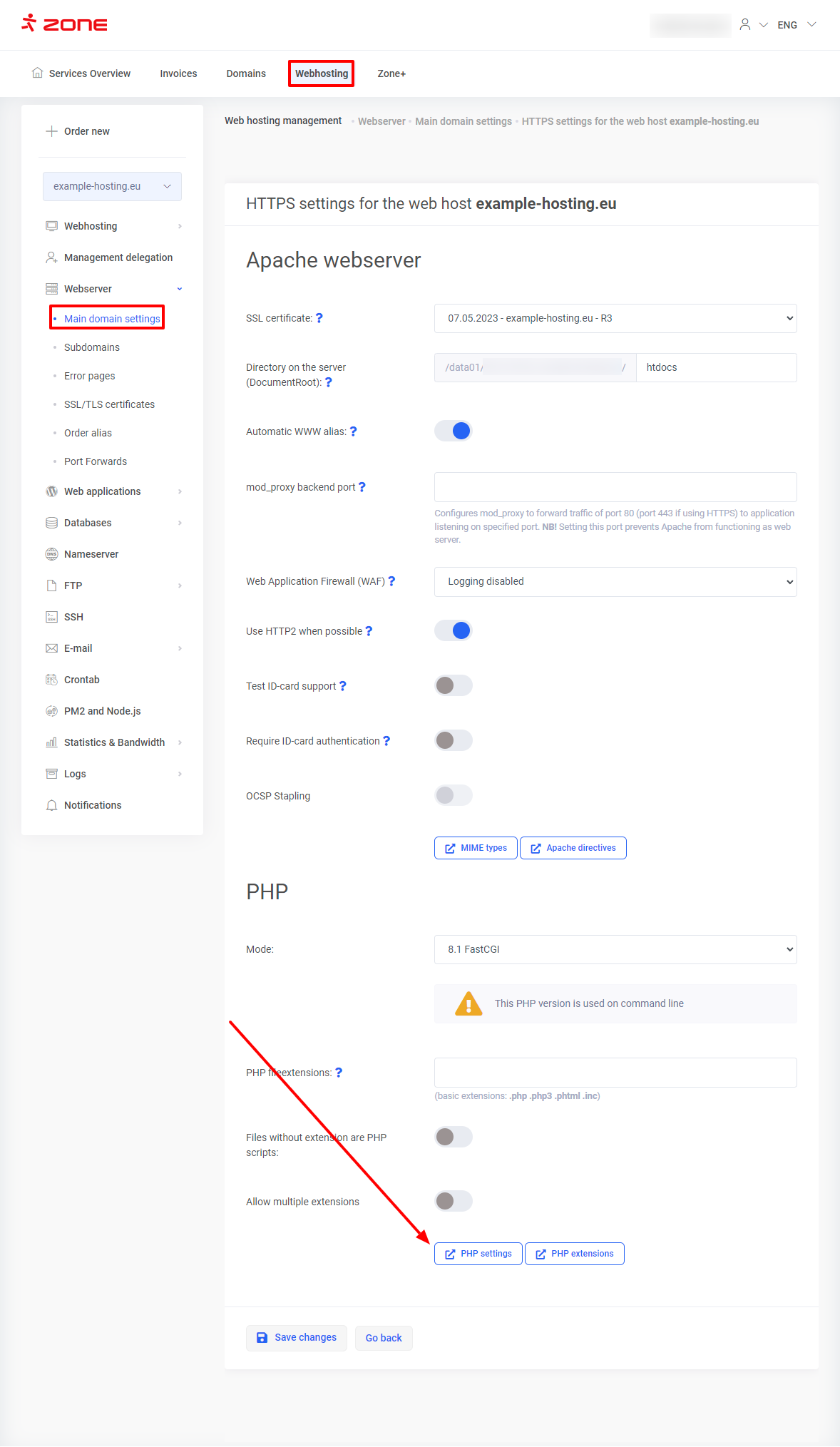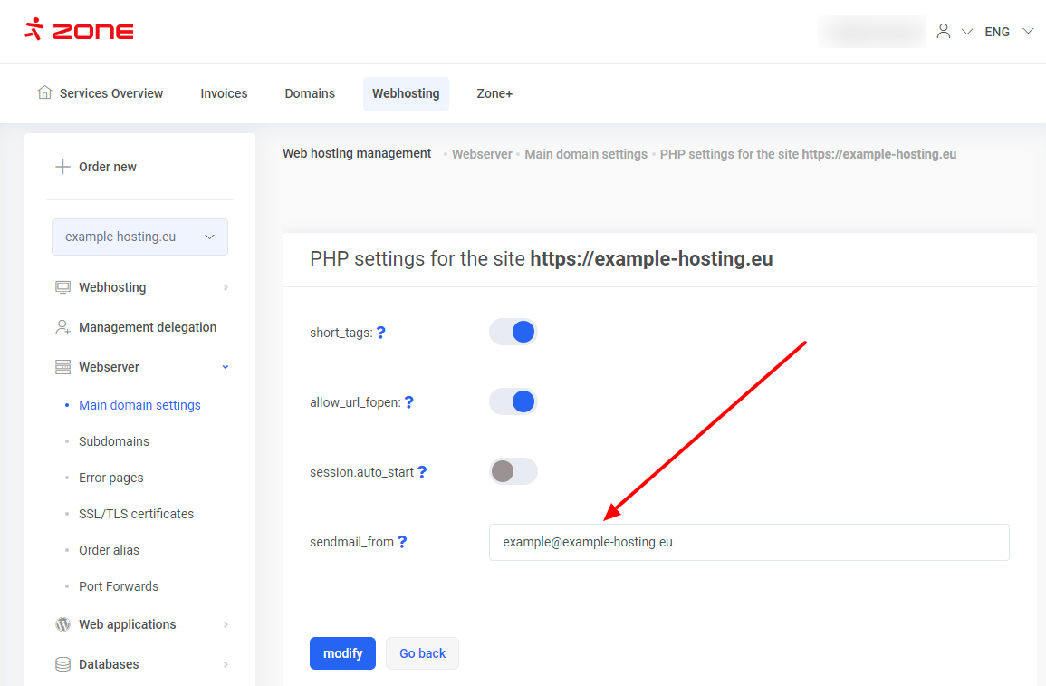 Te change the default @vserver.zonevs.eu address, log in to “My Zone” and choose Web hosting->Webserver->Main domain settings->Modify–>PHP settings. In the window that opens, change the sendmail_from value to: address@name.eu