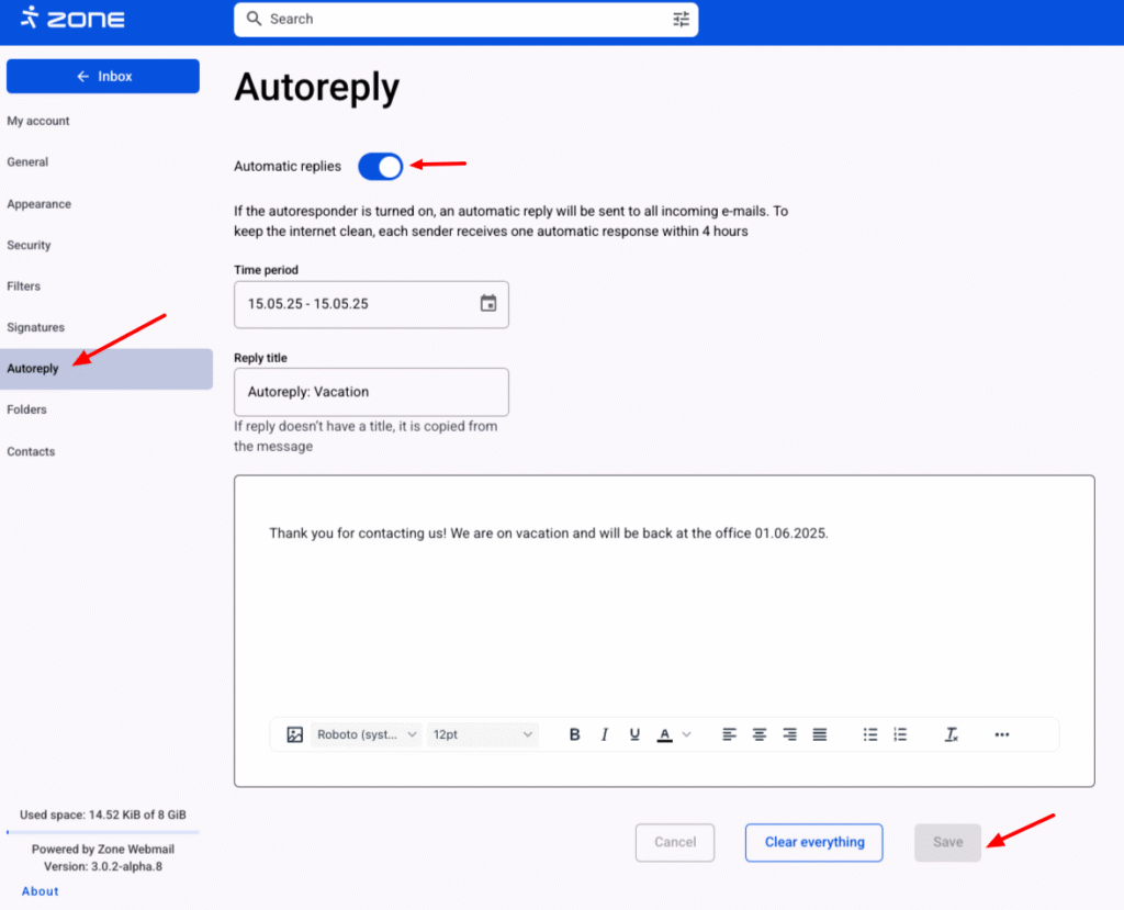 Enter the desired Time period for the auto-reply, the reply title and the content of the reply.