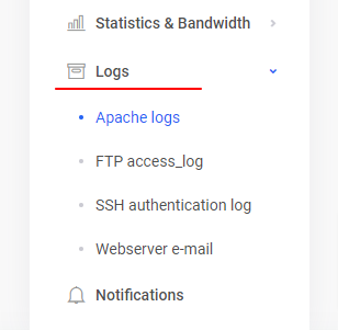 Apache webserver logs are located in the logs catalogue. Secure HTTPS connection logs are located in apache.ssl.access.log file. Logs are located in the “Logs” folder and other logs are visible via the server management “Logs” section: