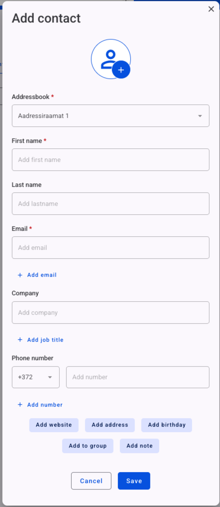 In the new window, select Addressbook, then enter the contact’s first and last name,  and email address. If required, you can also enter the company name, job title, phone number, birthday, etc. Once the details have been entered, click Save and the contact will be saved in the contact list.