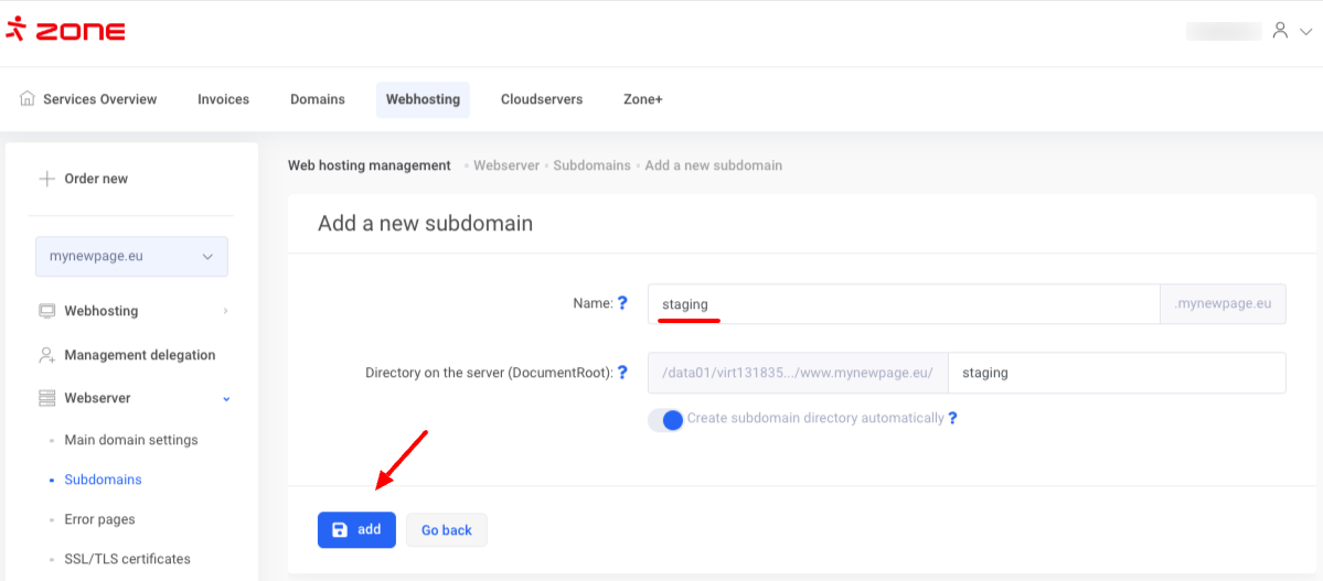 On the new page, enter the name of the subdomain, such as staging, test or shop.