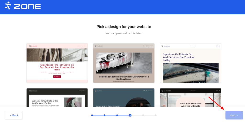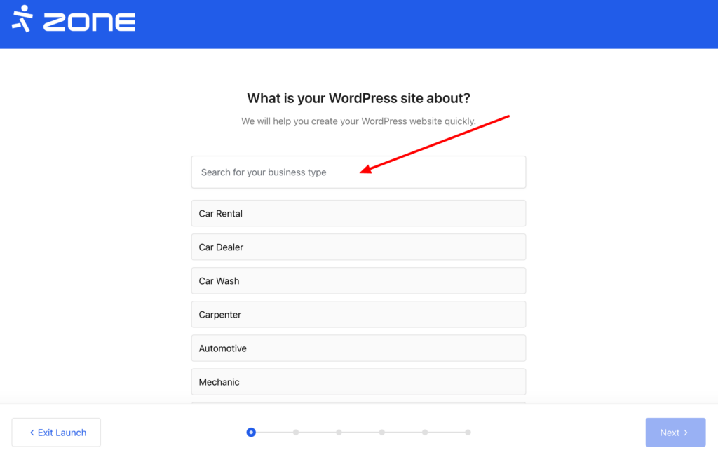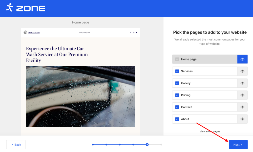 As soon as application is installed, you can start creating your website using the Assistant. First you should specify what the website is about. As an example, we use the “Car wash”: