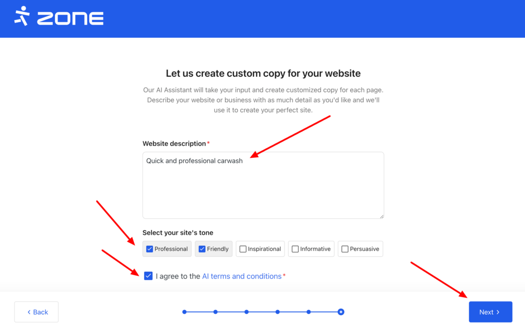 The last step is optional, you can add a description and a tone to the webpage, but you can skip this step (a “skip” button will be displayed if you leave the fields blank).