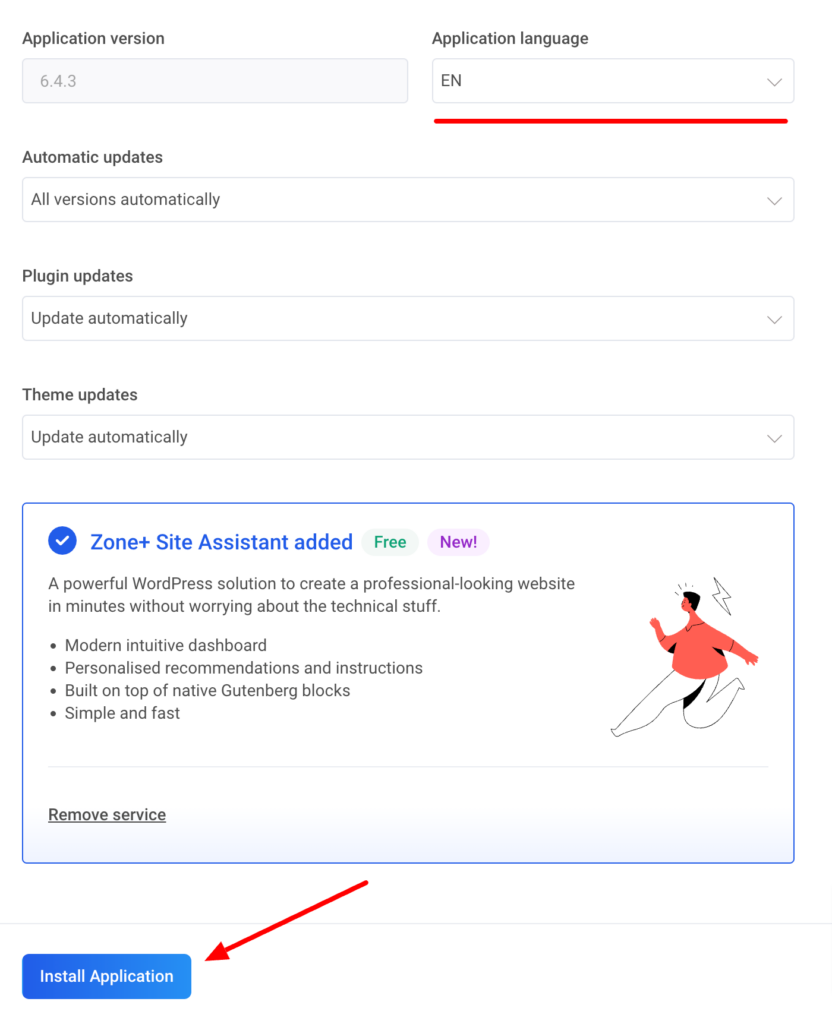 When installing the application, choose the WordPress language (EN for English):