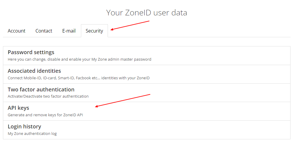 In the following window choose Security” and API keys.