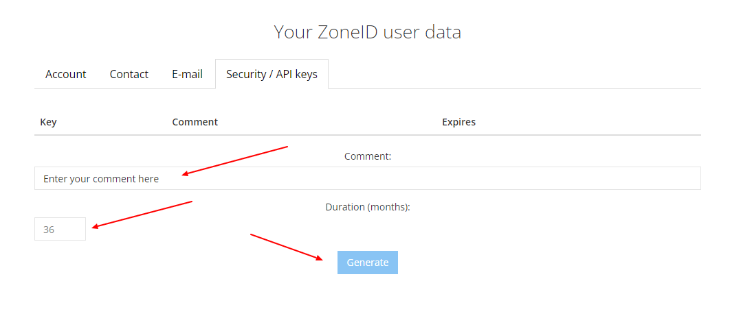 By default, the API key is valid for three years (36 months). To add a new key, press Generate.