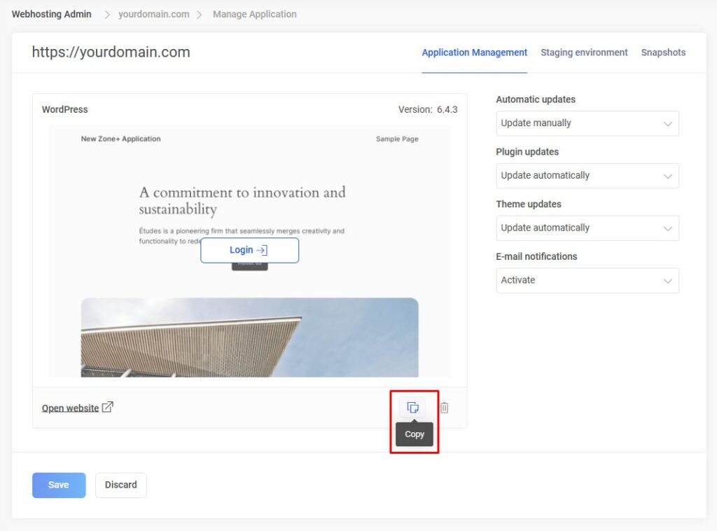 Choose the path for the copy. The Path field will stay empty by default – fill it in only if you deliberately wish to install the application to a domain’s subfolder.